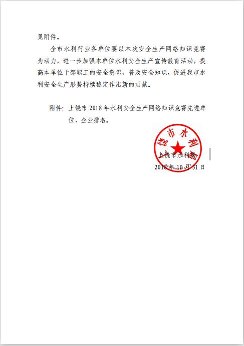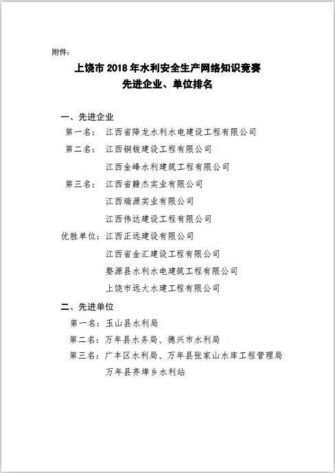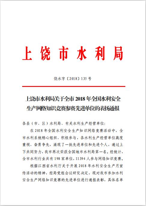 上饒市水利局關(guān)于全市2018年全國(guó)水利安全生產(chǎn)網(wǎng)絡(luò)知識(shí)競(jìng)賽參賽先進(jìn)單位的表?yè)P(yáng)通報(bào)
