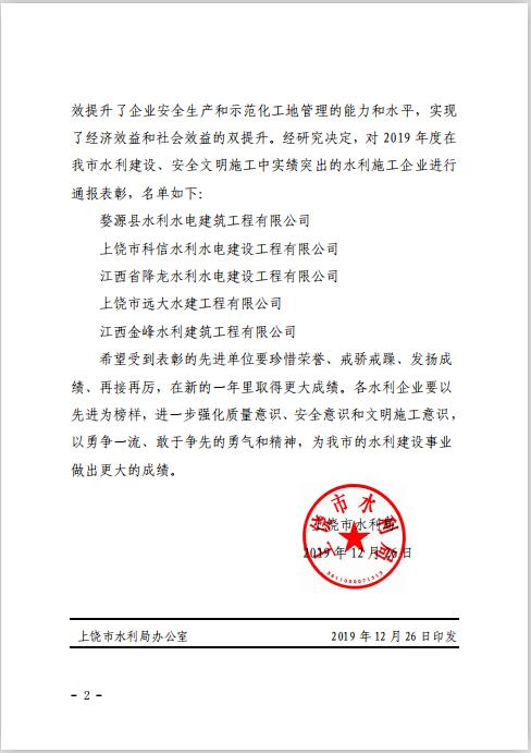上饒市水利局關(guān)于表彰2019年度上饒市水利施工企業(yè)安全生產(chǎn)先進(jìn)單位的通報