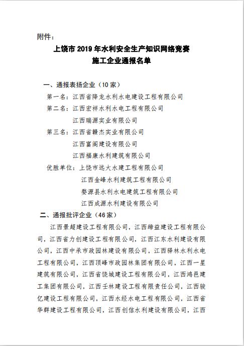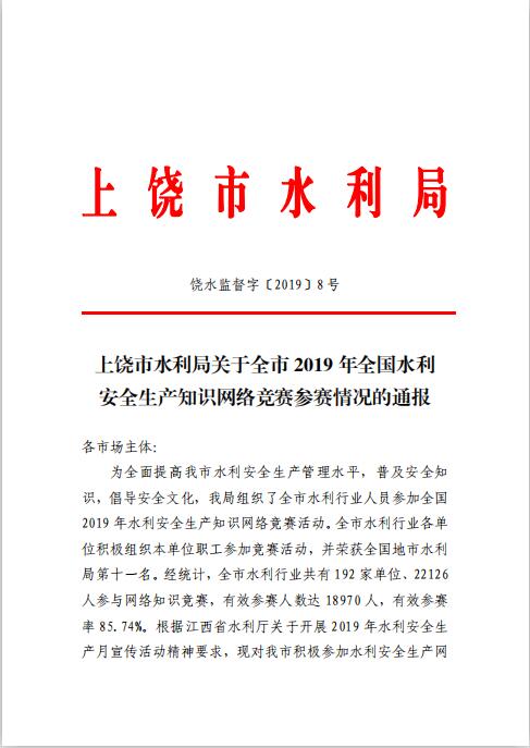 上饒市水利局關(guān)于全市2019年全國(guó)水利安全生產(chǎn)知識(shí)網(wǎng)絡(luò)競(jìng)賽參賽情況的通報(bào)