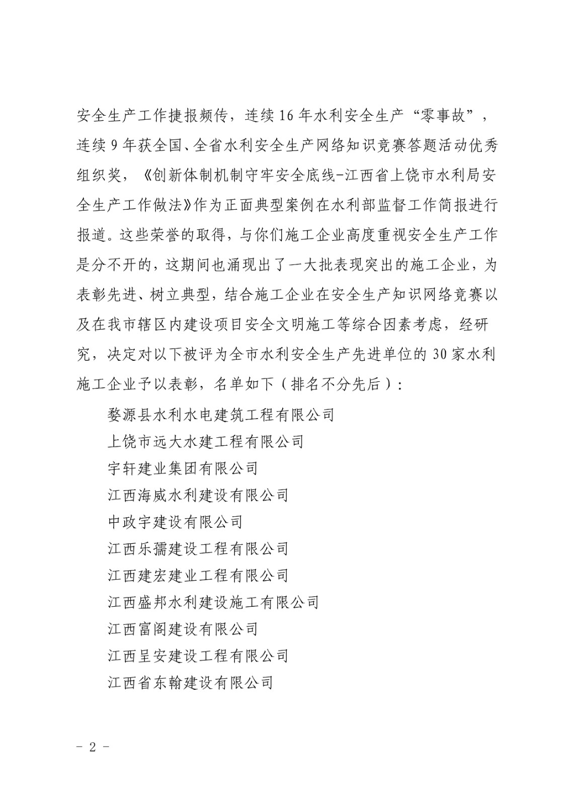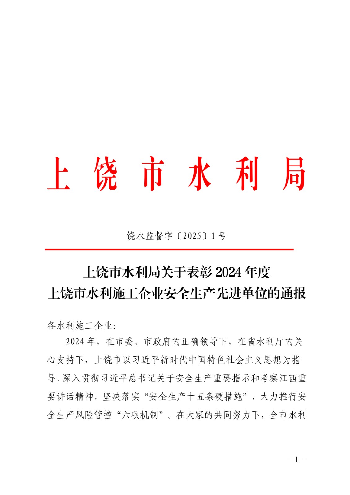 我公司榮獲“2024年度上饒市水利施工企業(yè)安全生產(chǎn)先進單位”
